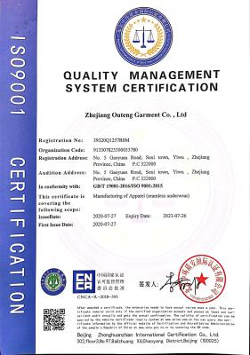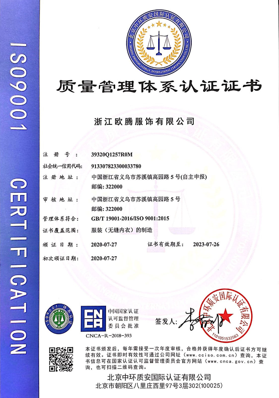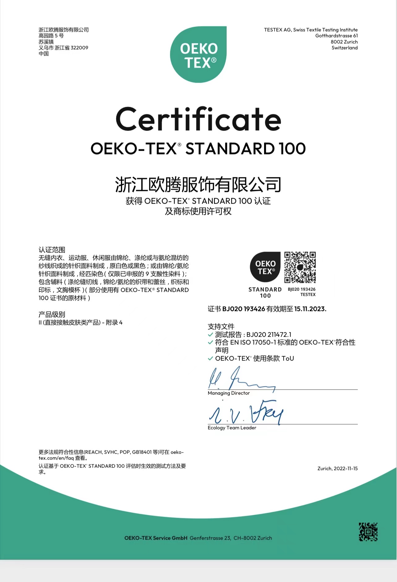 浙江歐騰服飾有限公司位于世界小商品之都-義烏。創(chuàng)立于2015年,是一家專業(yè)生產(chǎn)無縫針織運(yùn)動服飾和內(nèi)衣的工貿(mào)一體企業(yè),擁有自主出口權(quán)。 工廠的占地面積約16000平方米 ,引進(jìn)了大型圣東尼、高騰等多種先進(jìn)的制衣設(shè)備300余臺。月產(chǎn)能可達(dá)90萬件。 歐騰服飾每年投入近百萬資金打樣開發(fā)新產(chǎn)品,有著一支高素質(zhì)設(shè)計(jì)、技術(shù)員工隊(duì)伍。工廠先后通過了ISO 9001質(zhì)量管理體系認(rèn)證、BSCI認(rèn)證、GRS認(rèn)證、OEKO-TEX國際生態(tài)紡織品認(rèn)證等多項(xiàng)專利檢測報(bào)告??商峁㎡EM&ODM服務(wù)。歐騰服飾以一套完整、科學(xué)的質(zhì)量管理體系,生產(chǎn)的服裝從原材料紗線到成衣,質(zhì)量完全能夠滿足國內(nèi)、國際質(zhì)量要求。獲得了客戶一致好評。工廠先后獲得省科技型企業(yè)、國家高新企業(yè)、義烏市誠信講信用單位、規(guī)上企業(yè)、信用AAA級等榮譽(yù)。